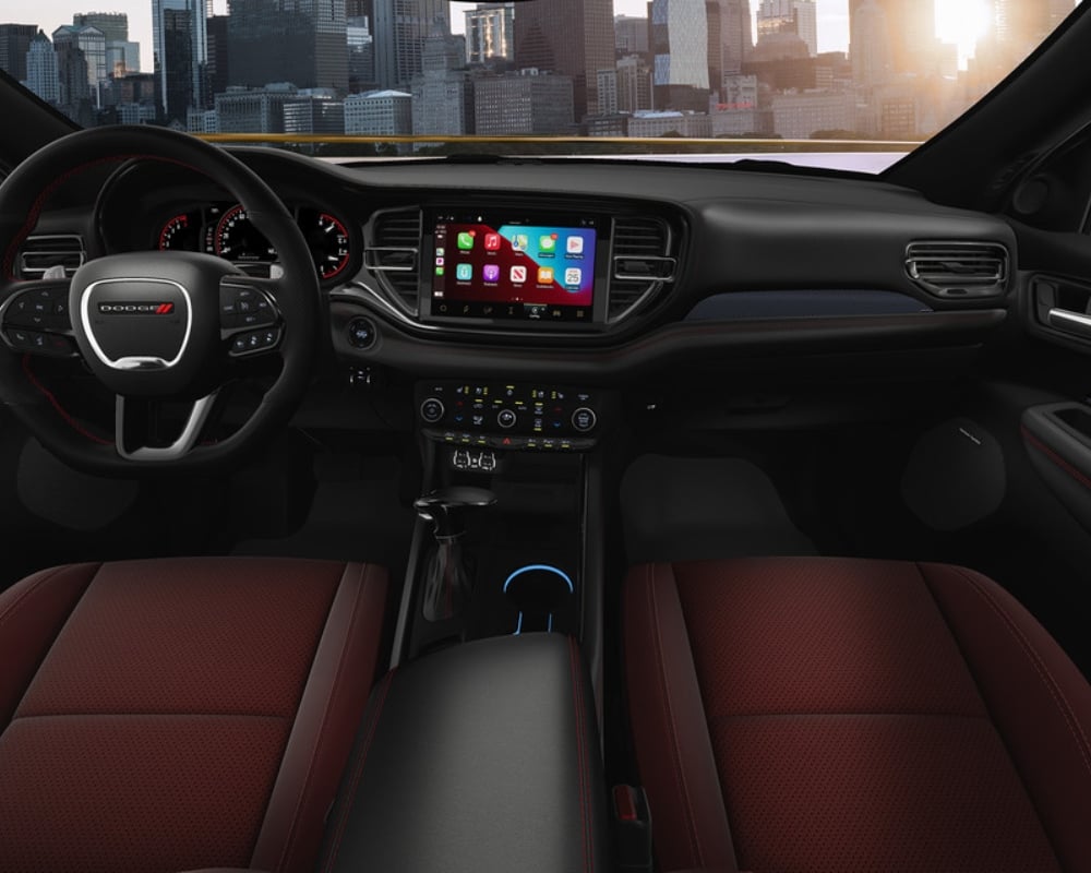Inside, the Durango is built for both comfort and function. The spacious cabin seats up to seven passengers, making it a great option for families or drivers who need extra room. The cloth-trimmed seats in the base model are designed for durability and long-lasting comfort, while an 10.1-inch Uconnect® 5 touchscreen comes standard, offering an intuitive infotainment system that includes Apple CarPlay®, Android Auto™, and Bluetooth® connectivity. The available premium Alpine® sound system in higher trims takes in-cabin entertainment to the next level.