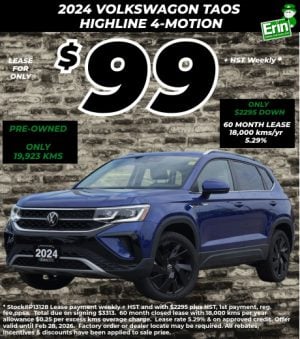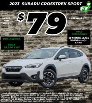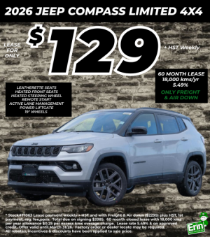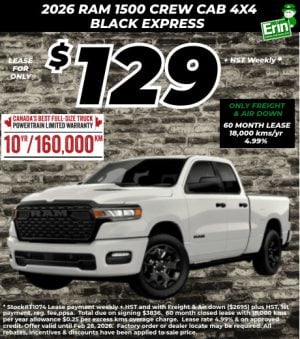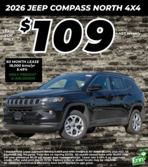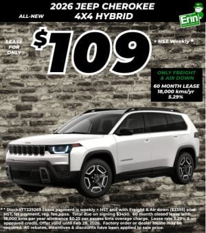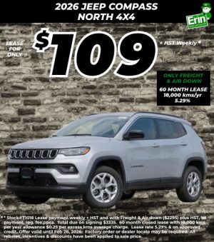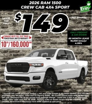 * Stock#T1101 Lease payment weekly + HST and with Freight & Air down ($2695) plus HST, 1st payment, reg. fee,ppsa. Â Total due on signing $3881. Â 60 month closed lease with 18,000 kms per year allowance $0.25 per excess kms overage charge. Â Lease rate 4.99% & on approved credit. Offer valid until march 31, 2026. Â Factory order or dealer locate may be required. All rebates, incentives & discounts have been applied to sale price.